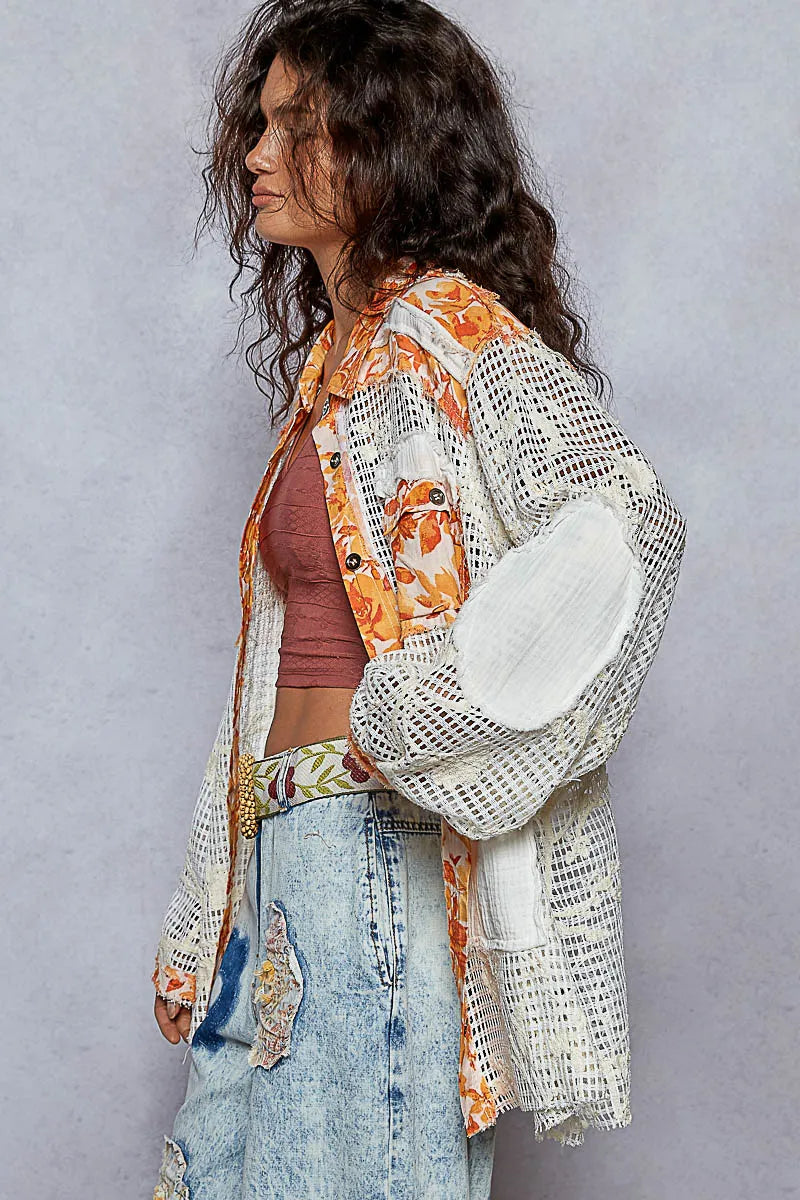 POL Floral Print Crochet Button Up Shirt