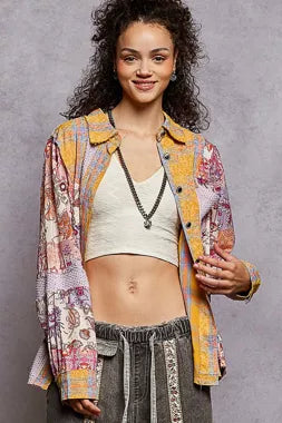 POL Printed Button Down Long Sleeve Exposed Seam Shirt